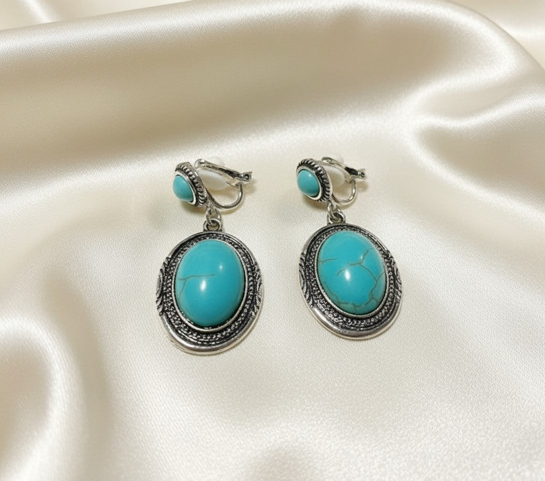 Clip on 1 3/4" western silver and turquoise stone oval earrings