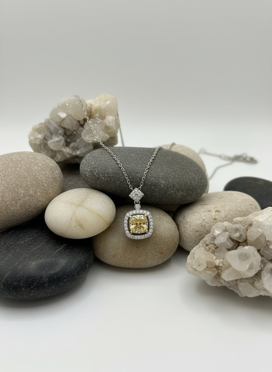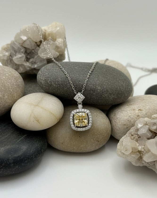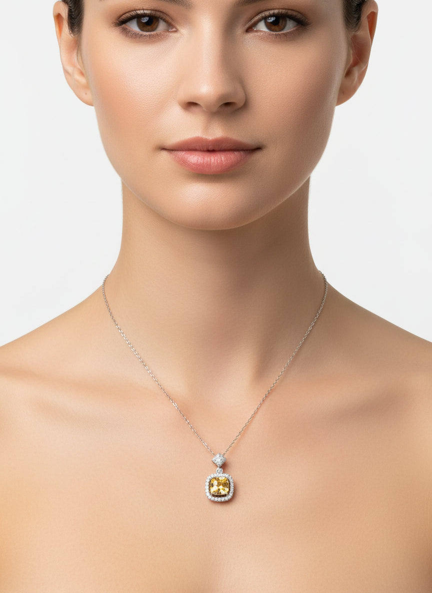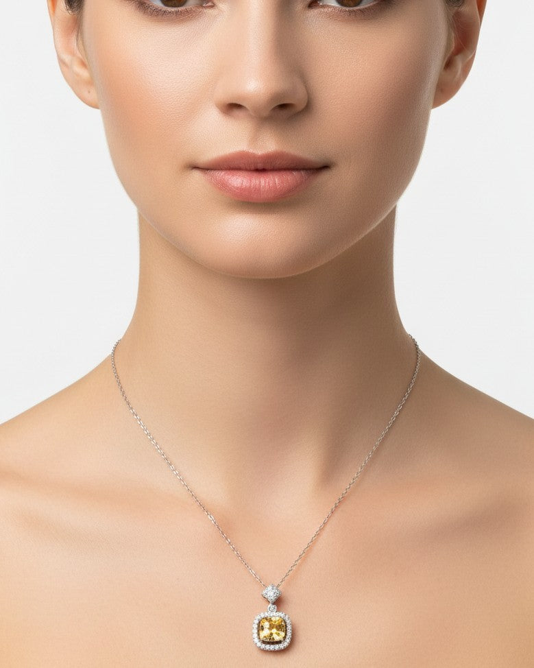 Sterling silver 16" necklace featuring a striking pendant adorned with clear and yellow stones in a sophisticated design. Crafted from genuine sterling silver, this piece combines timeless elegance with contemporary appeal. The complementary stone tones create visual depth and versatility, making it suitable for both everyday wear and special occasions.