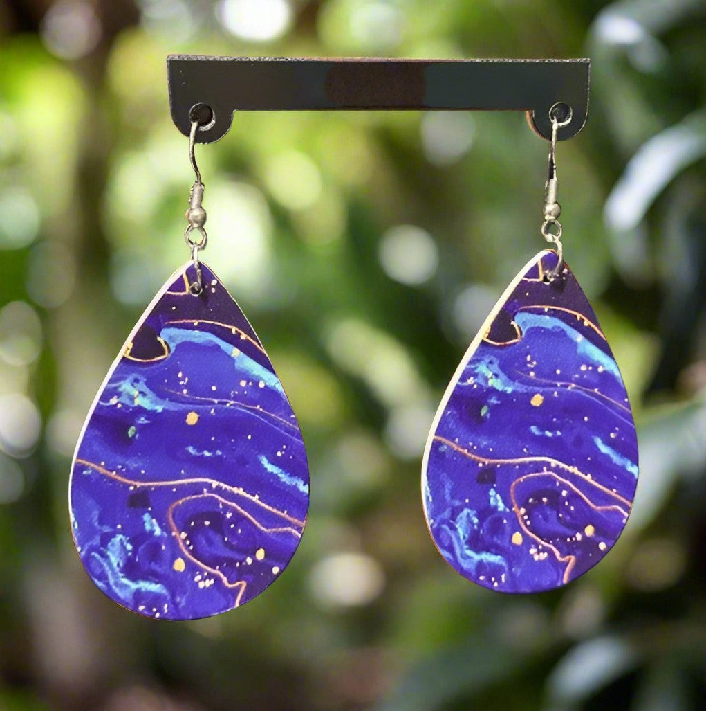 Pierced 3 1/4" silver, blue, gold multi colored pleather teardrop earrings