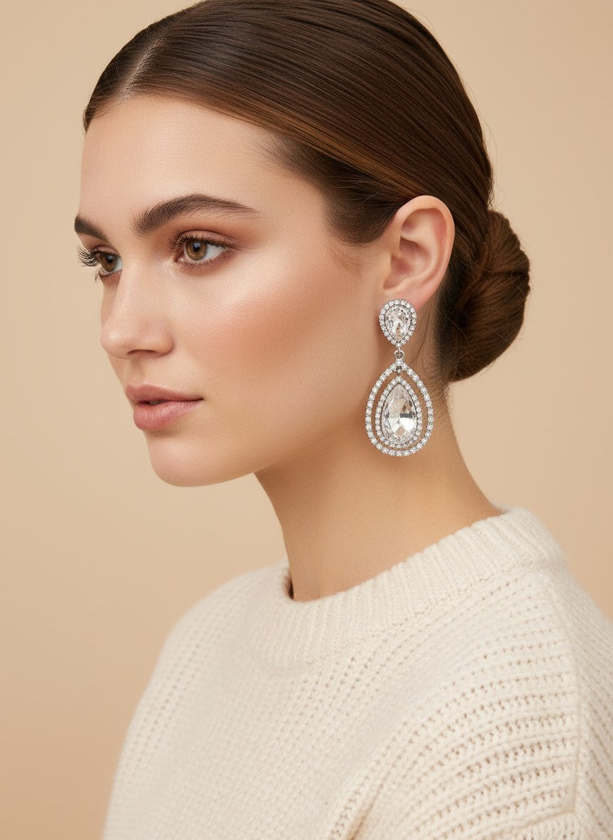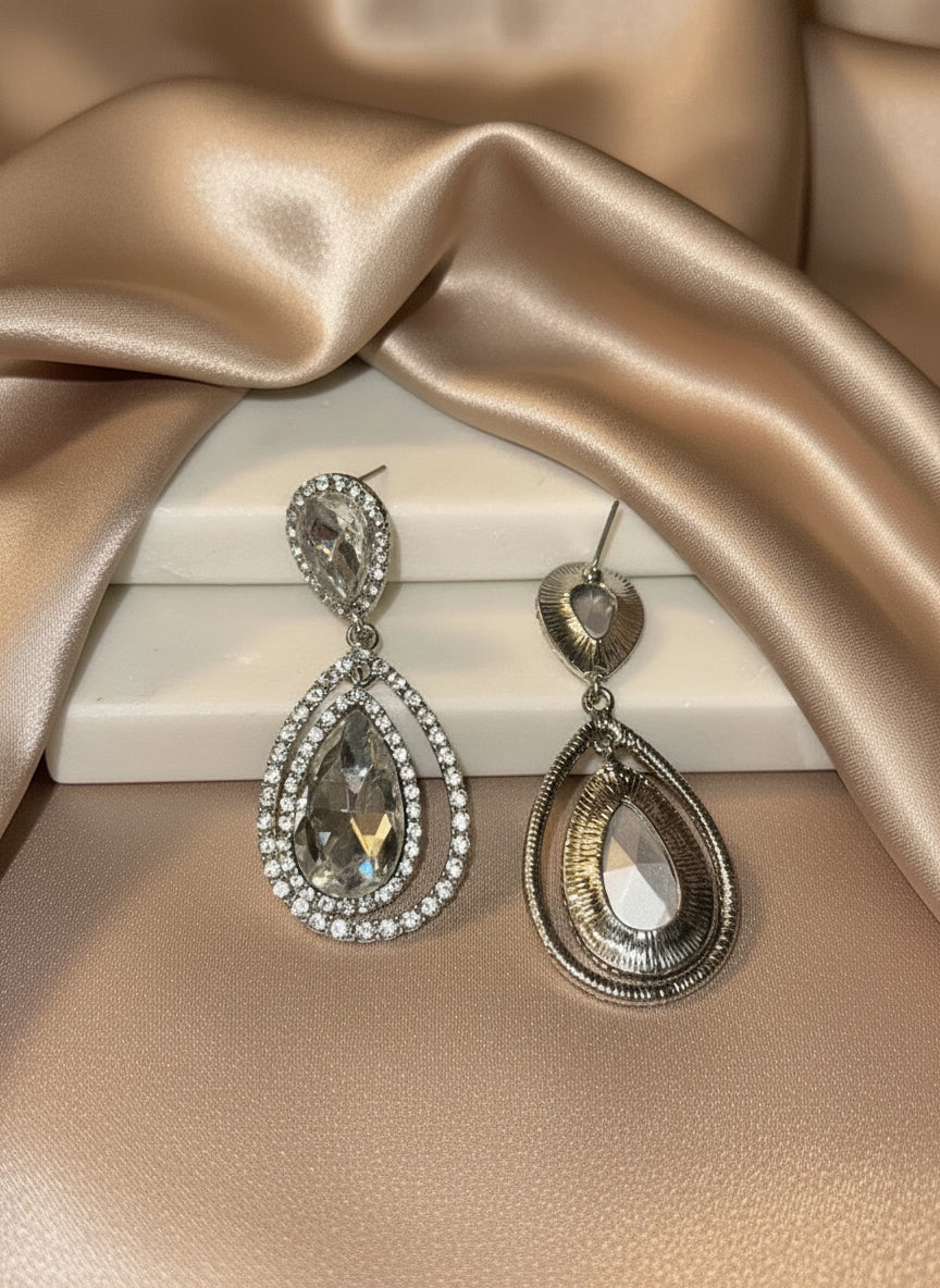 Pierced 2 1/2" large silver and clear stone cutout dangle teardrop earrings