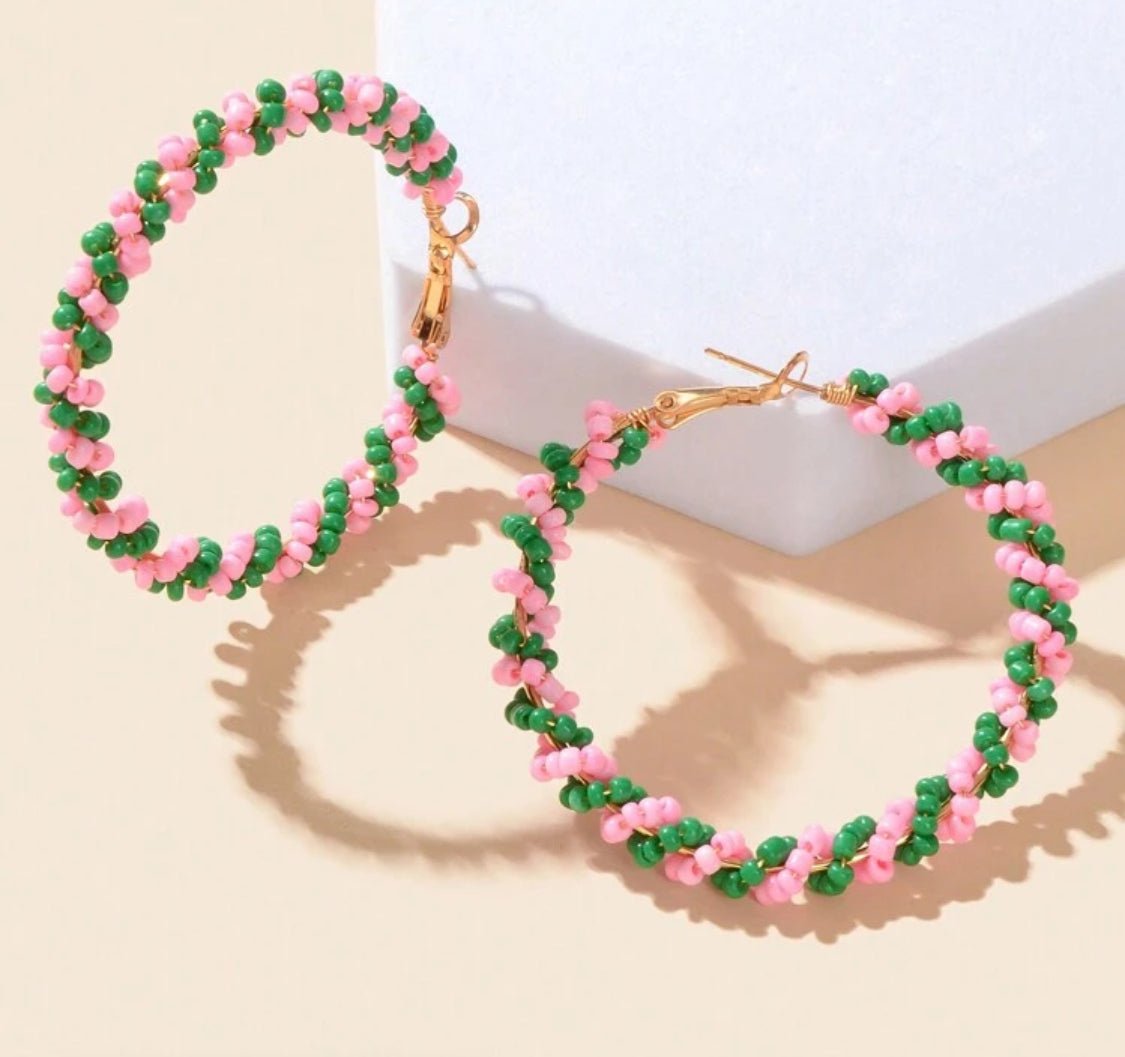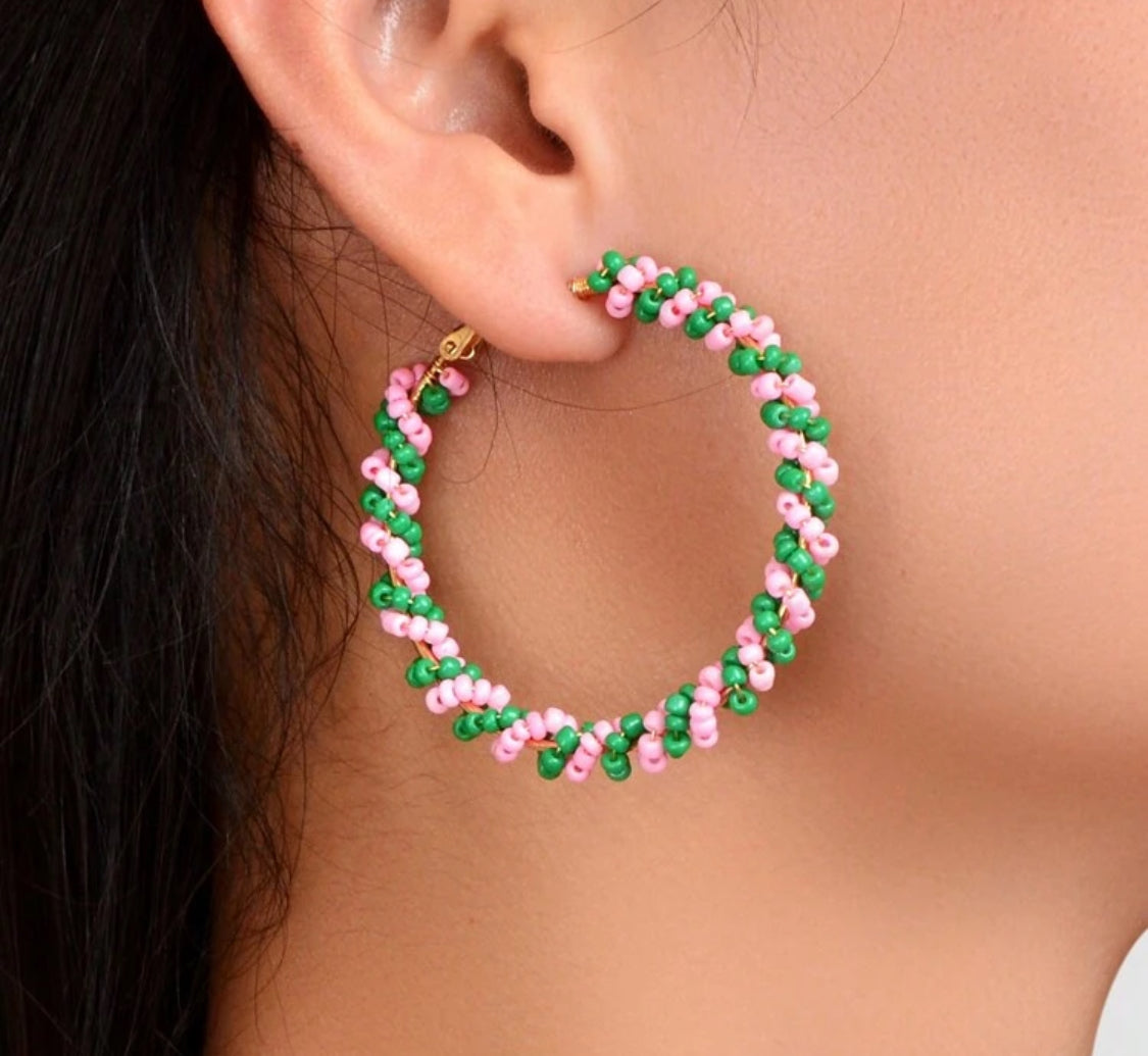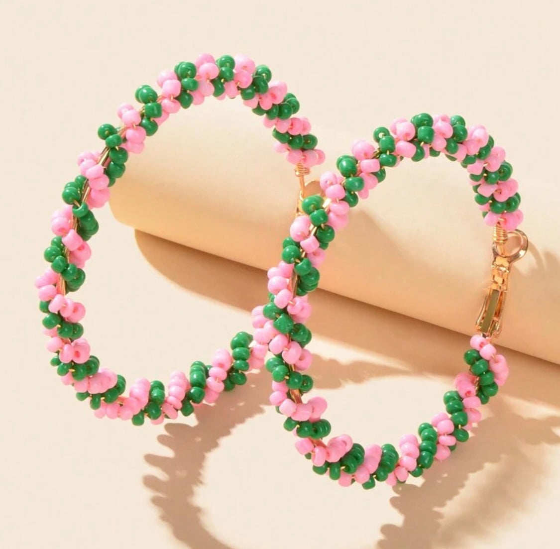Elevate your style with these 2 1/4" pierced hoop earrings, featuring a stunning blend of gold, pink, and green seed beads. Their vibrant colors add a fresh, playful touch to any outfit, while the lightweight design ensures comfortable wear all day. Perfect for making a bold yet elegant statement, these earrings effortlessly enhance your look with a unique, handcrafted charm.