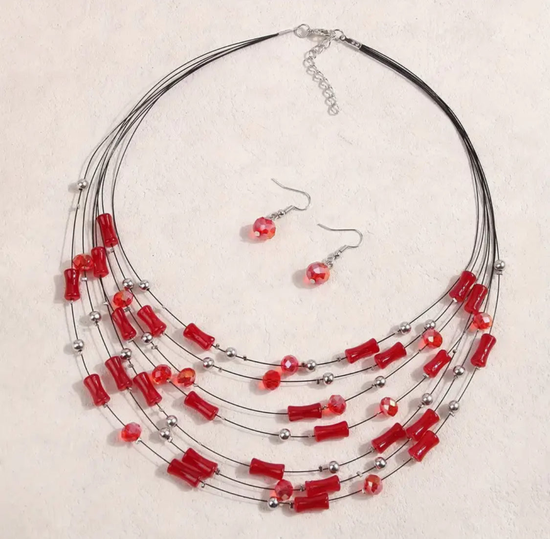 Elevate your style with this pierced silver and red long bead wire necklace and earring set. The striking combination of sleek silver and vibrant red beads creates a bold, elegant look perfect for any occasion. Lightweight and comfortable, this set adds a touch of sophistication and color to your outfit, making you stand out effortlessly.