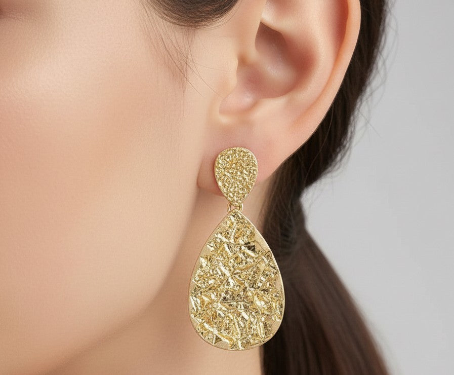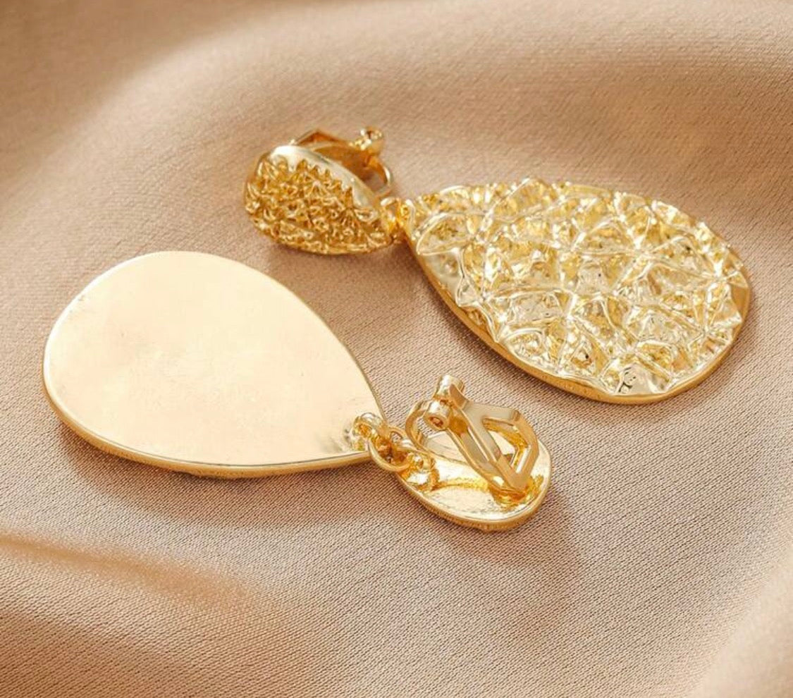 Trendy 2" clip on gold textured dangle solid teardrop earrings