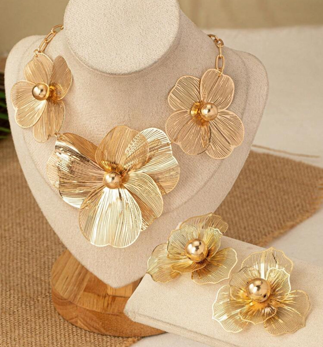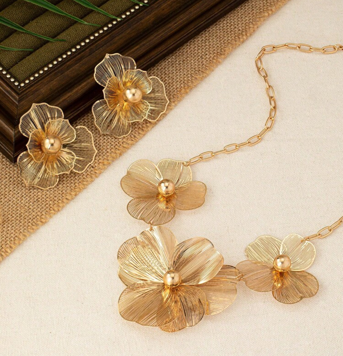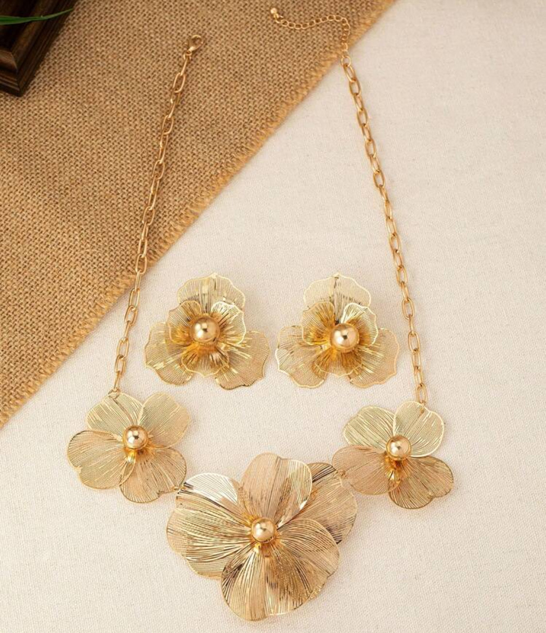 Elevate your style with this trendy gold chain-link necklace and matching pierced earrings, featuring delicate cut-out flower designs. Perfect for adding a touch of elegance and modern flair to any outfit, this set effortlessly blends sophistication with contemporary charm. Ideal for both everyday wear and special occasions, it’s a must-have accessory that enhances your look with subtle shine and unique detail.
