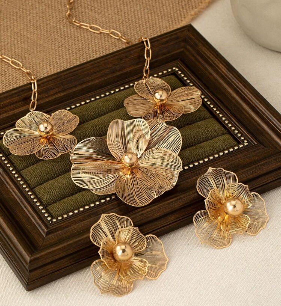 Trendy pierced gold chain link cutout flower necklace and earring set