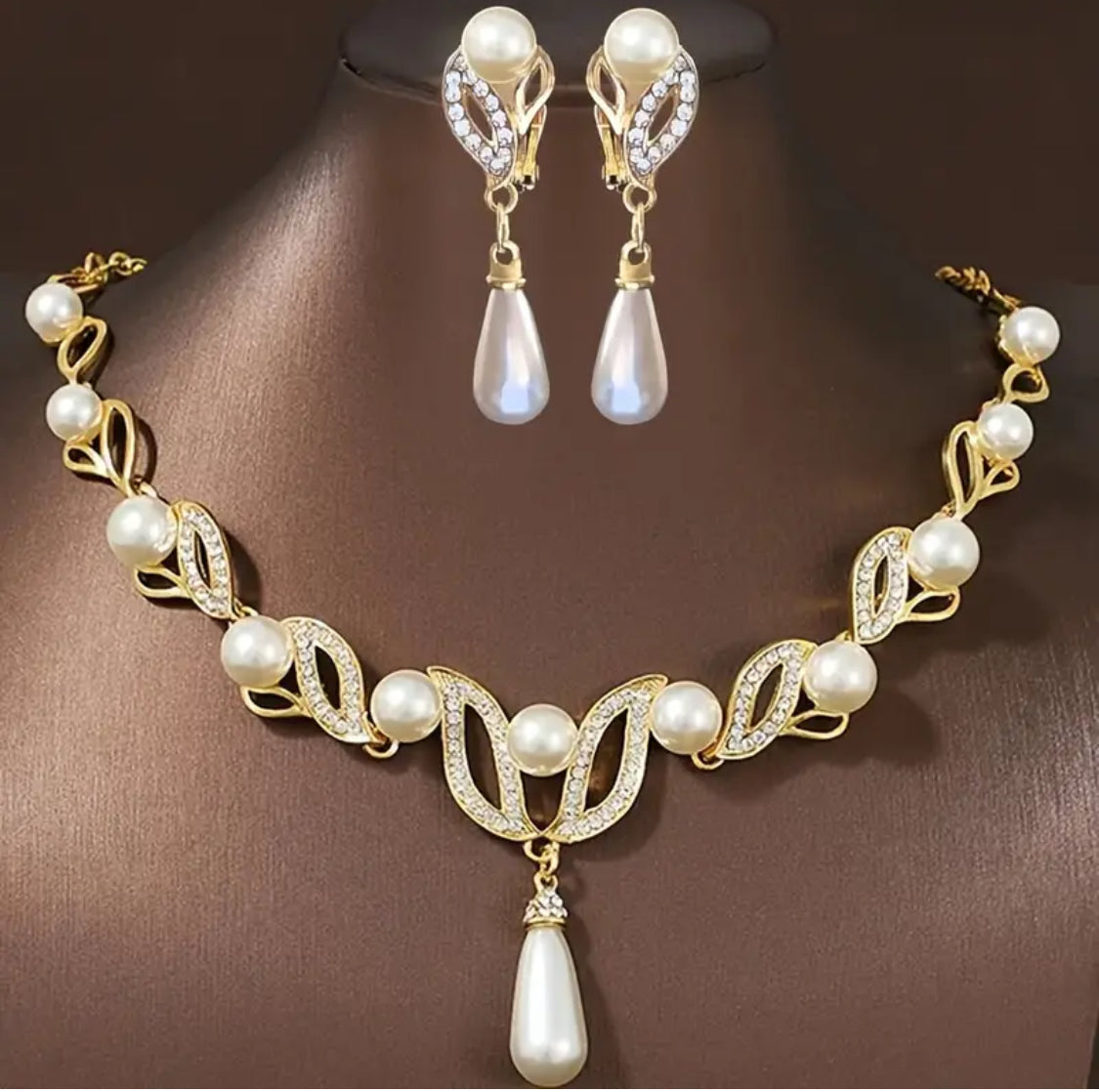 Step back in time with this stunning vintage pierced gold vine necklace and earring set. Adorned with clear stones and white pearls, this jewelry set will add a touch of elegance to any outfit. Feel like a true vintage beauty with this classic and timeless set!