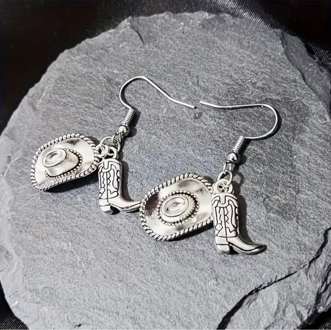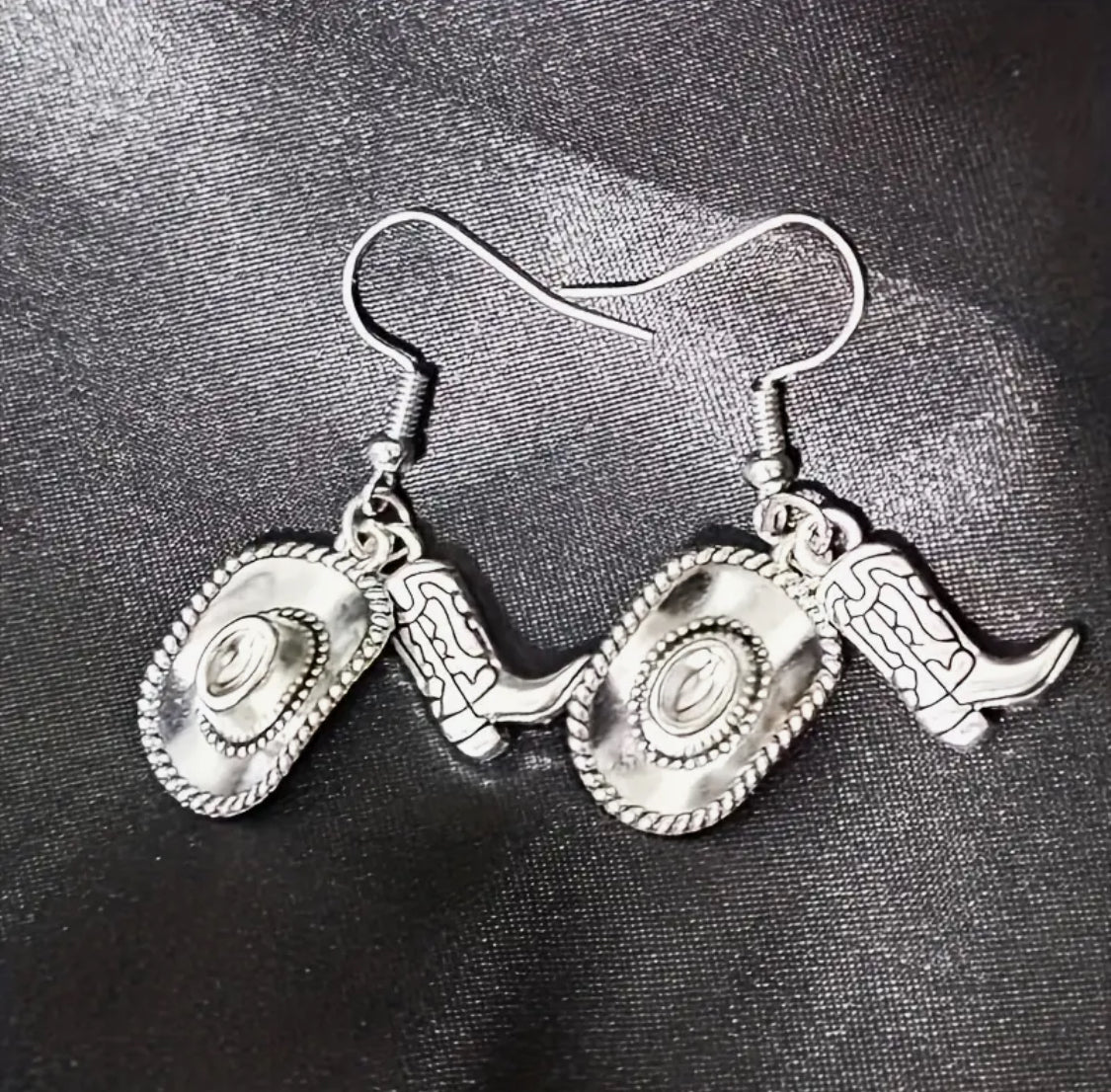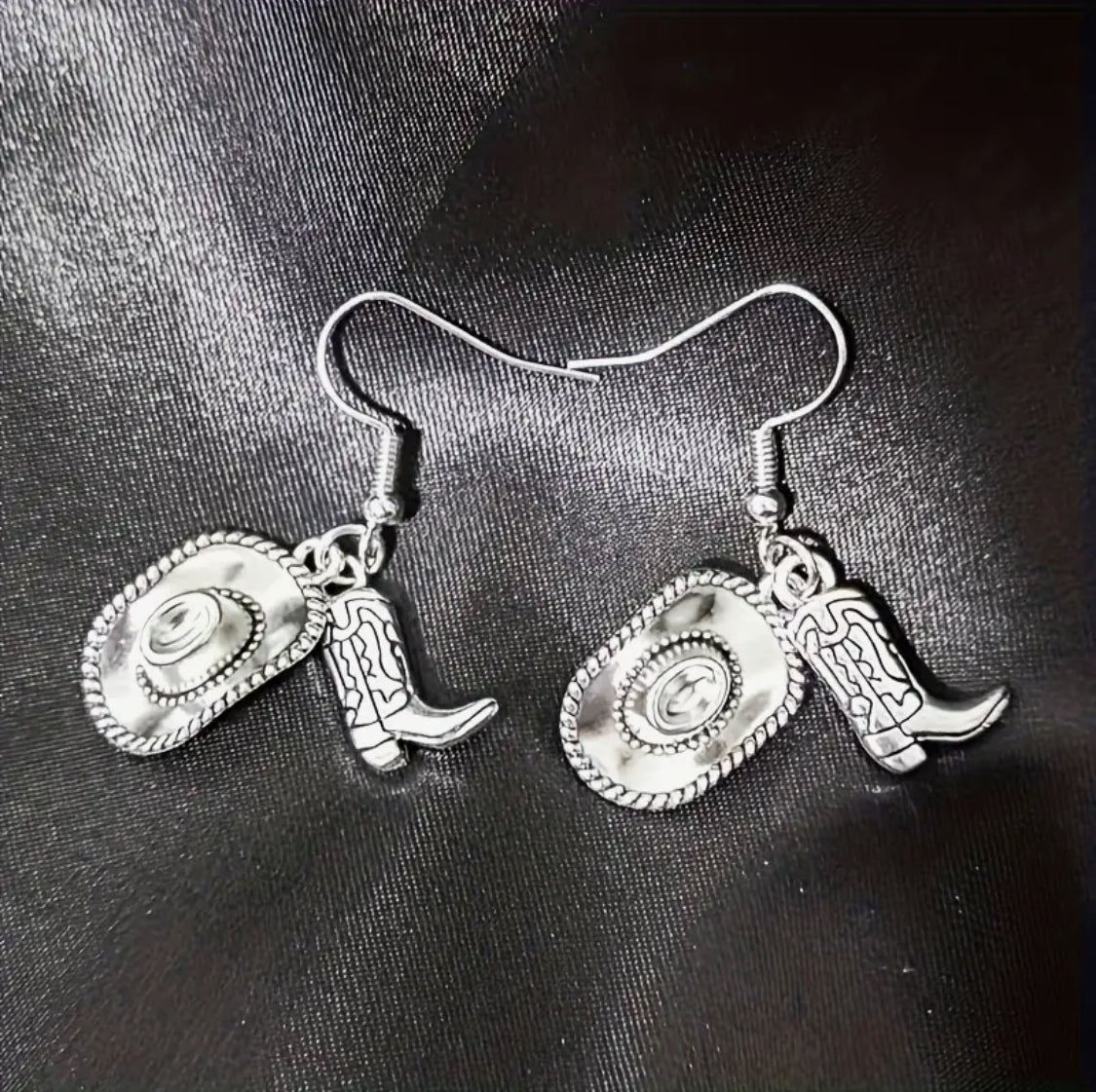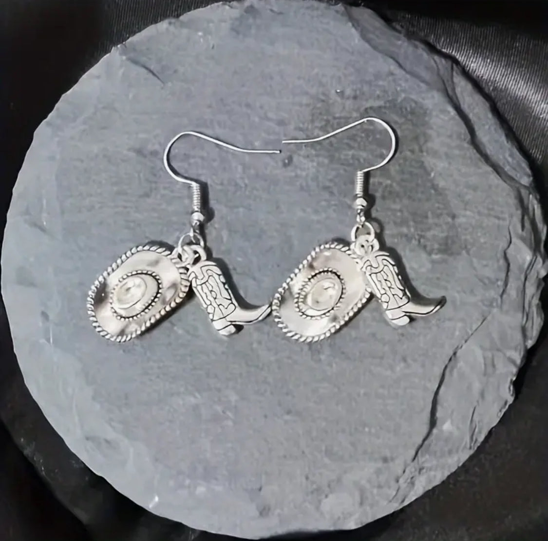 Western 2 1/4" pierced silver boot, textured hat and star dangle earrings