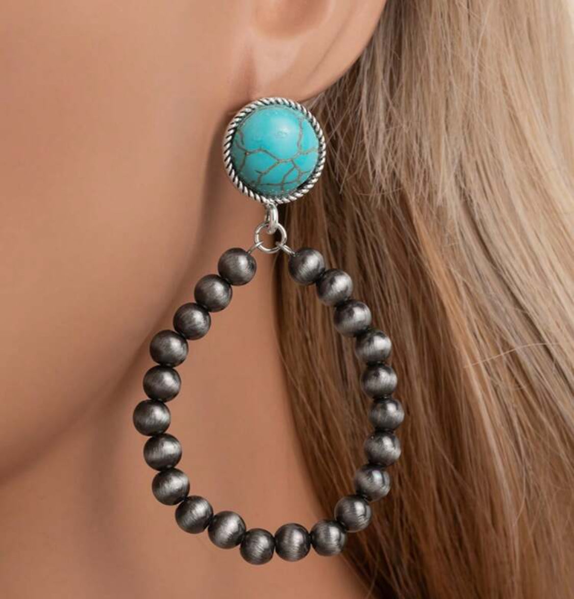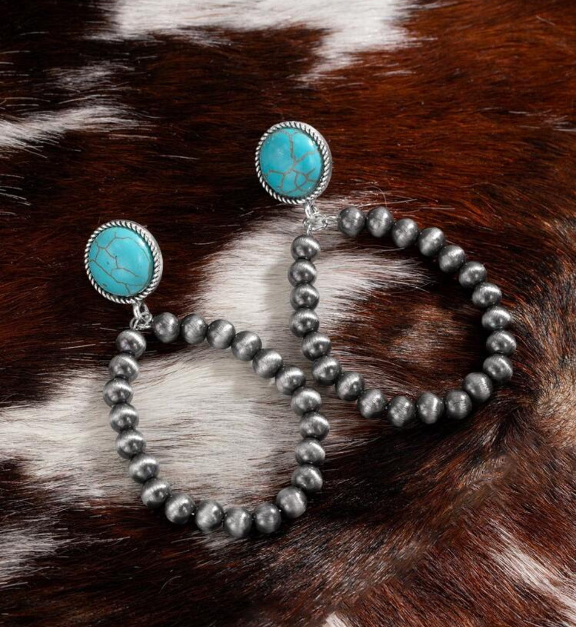 Elevate your look with these western 3 1/4" long pierced earrings, featuring a striking combination of gunmetal/gray beads and vibrant turquoise stones. Their elegant dangle design adds movement and color, making them perfect for adding a bold, stylish touch to any outfit. Durable yet lightweight, they offer comfort without compromising on statement-making appeal.