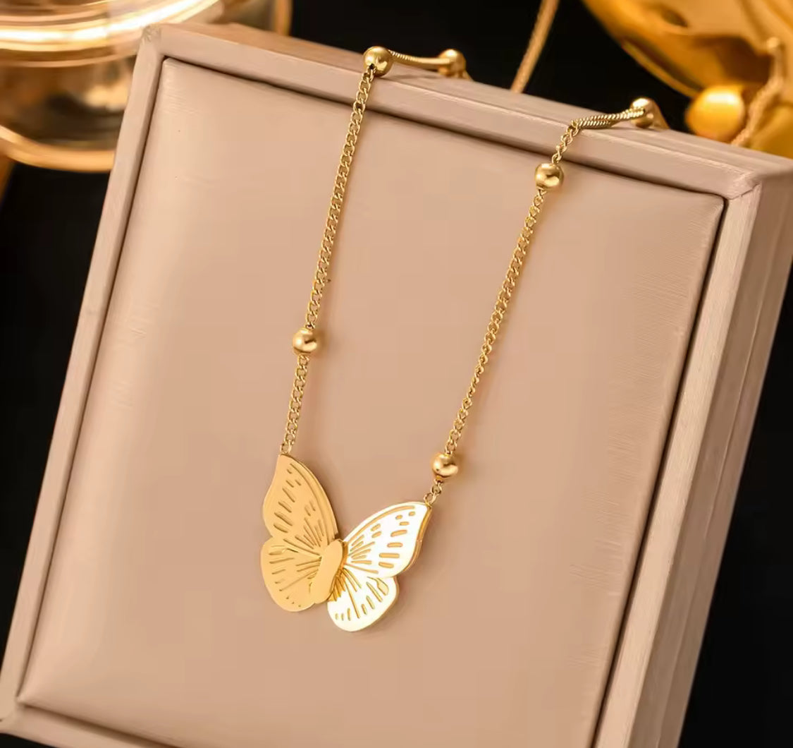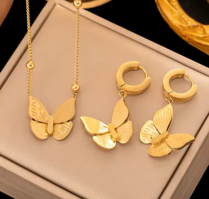 Transform your look with this enchanting stainless steel butterfly jewelry set. The pierced gold bead butterfly design creates a delicate yet striking statement that captures attention. Crafted from durable stainless steel, this necklace and earring combination offers both elegance and longevity.