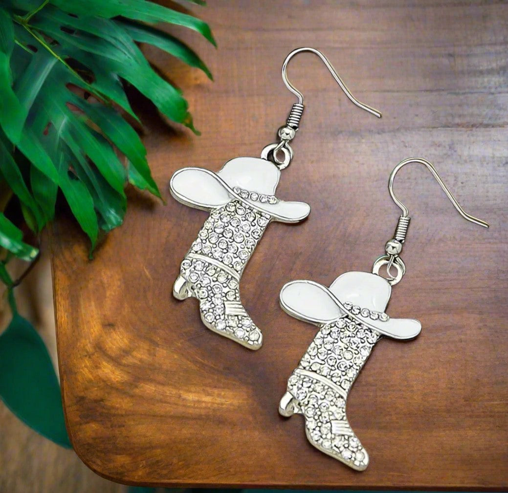 Showcase your Western spirit with these 1 3/4" pierced silver earrings featuring detailed hat and boot charms adorned with white and clear stones. Their sparkling accents add a refined touch to the rugged design, making them perfect for elevating both casual and dressy looks with authentic Western style.