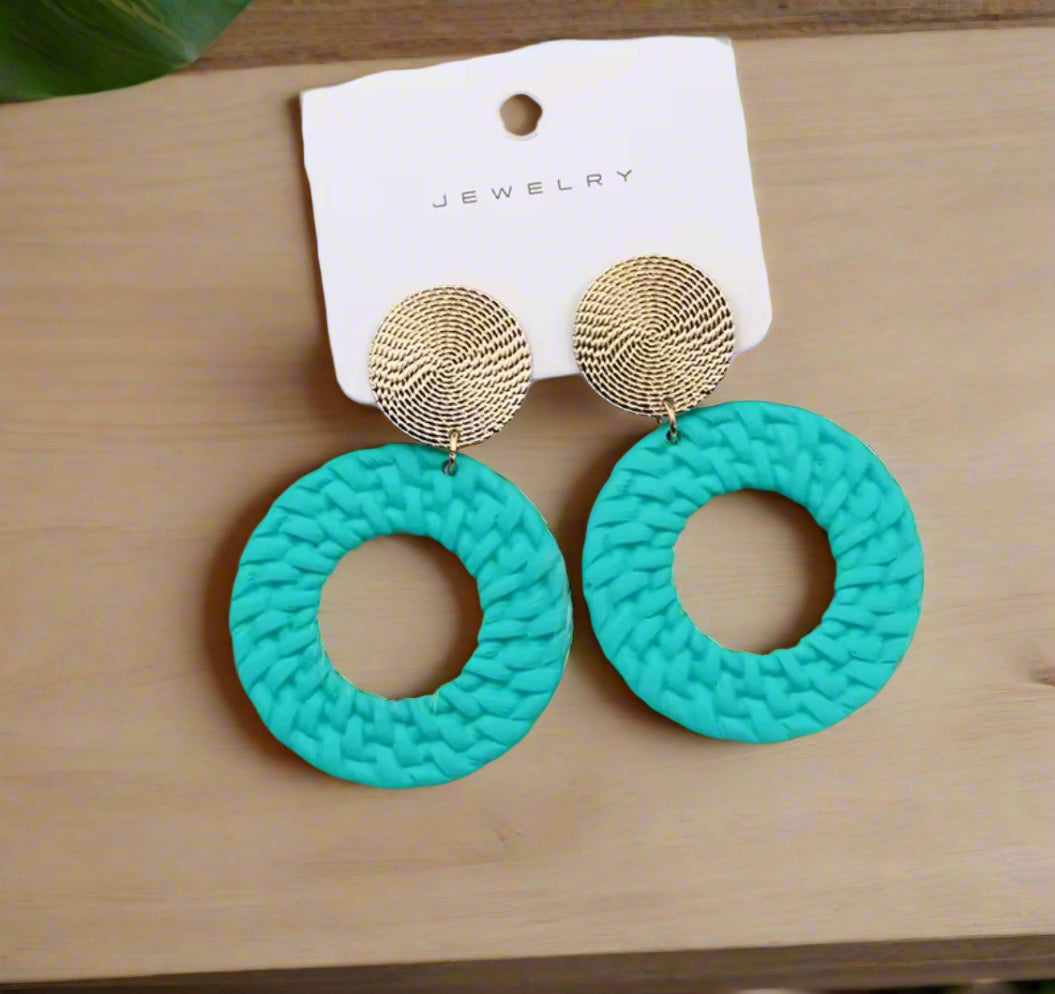 Elevate your style with our beautifully crafted clip-on 2 1/2" round gold top earrings. The elegant turquoise woven hoop adds a touch of sophistication to any outfit. No need for pierced ears, these clip-ons offer comfort and style in one.