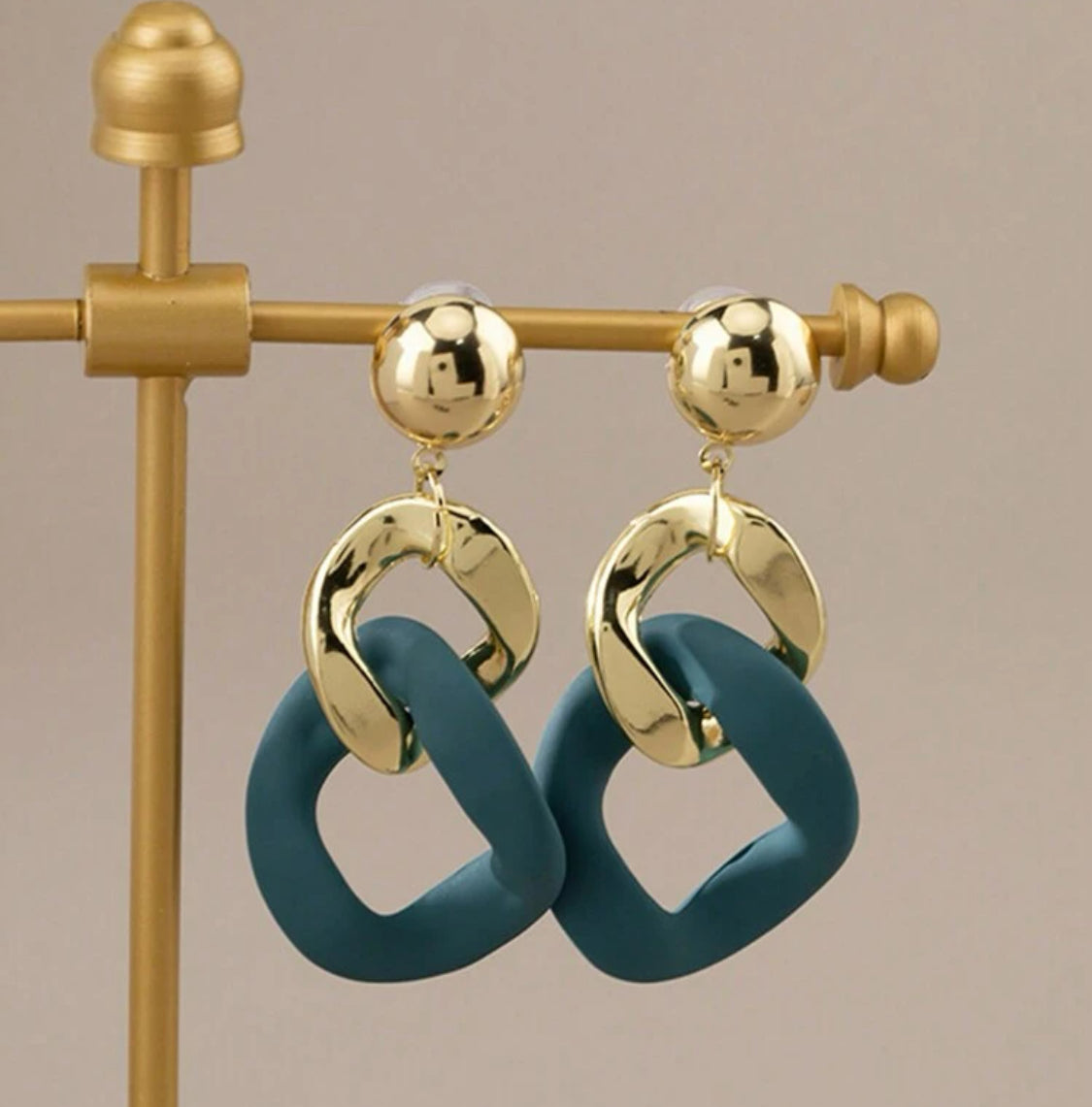 Make a bold statement with these 3" large clip-on earrings featuring gold and turquoise chain link dangles. Designed for comfort, they offer a secure fit without piercing, combining striking style with easy wearability. Perfect for adding vibrant color and modern edge to any outfit, these earrings elevate your look with effortless confidence.
