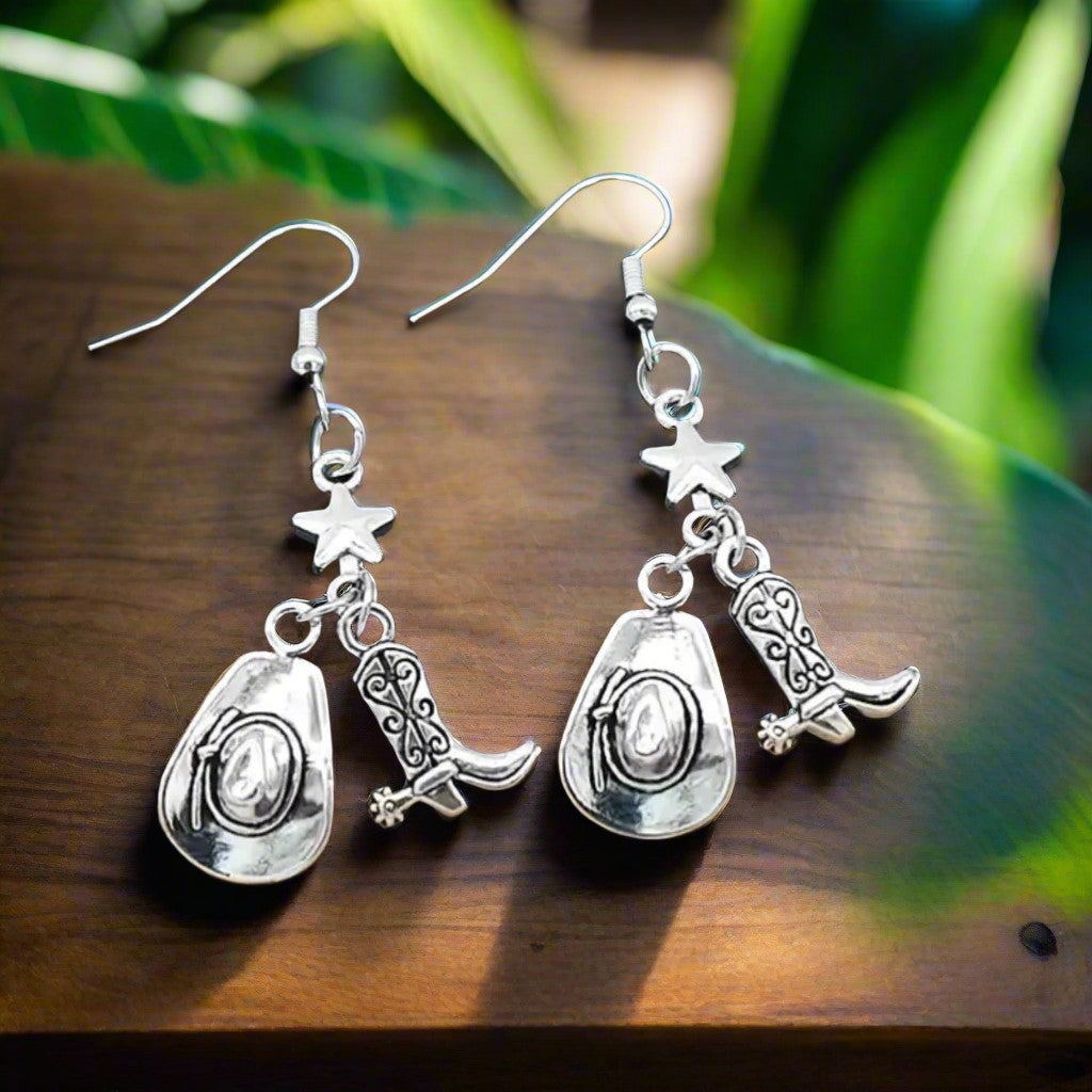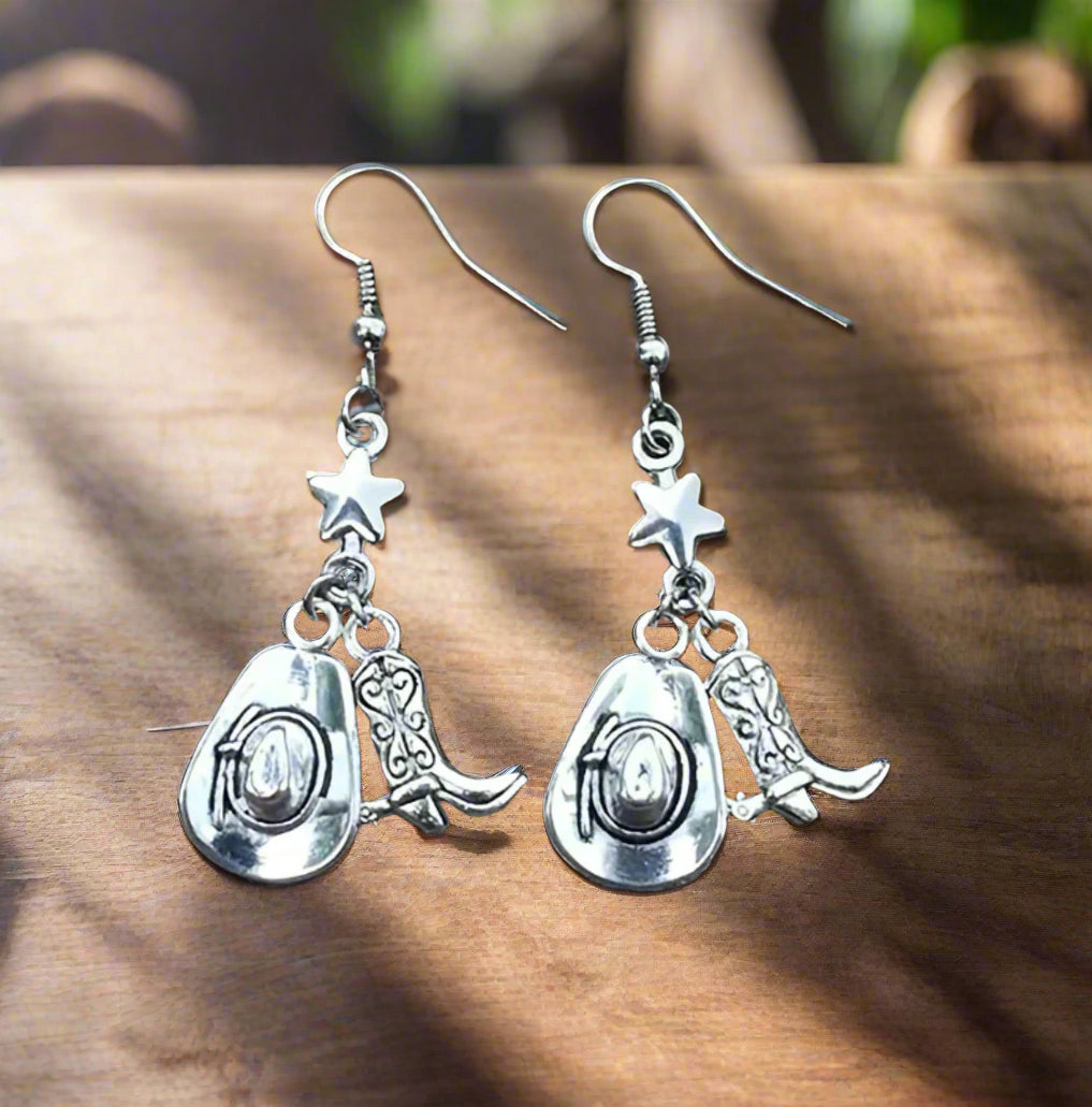 Add a touch of Western charm with our 2 1/4" pierced silver boot, hat, and star dangle earrings! Perfect for any cowgirl, these earrings will complete any outfit with a fun and stylish flair. The intricate design and lightweight feel make them perfect for all-day wear. Upgrade your accessory game now!