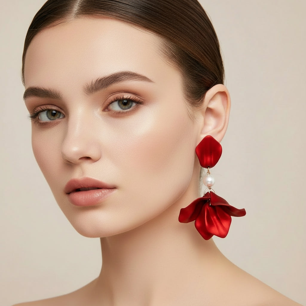 Classy clip on 3" long red petal dangle earrings with a center white pearl