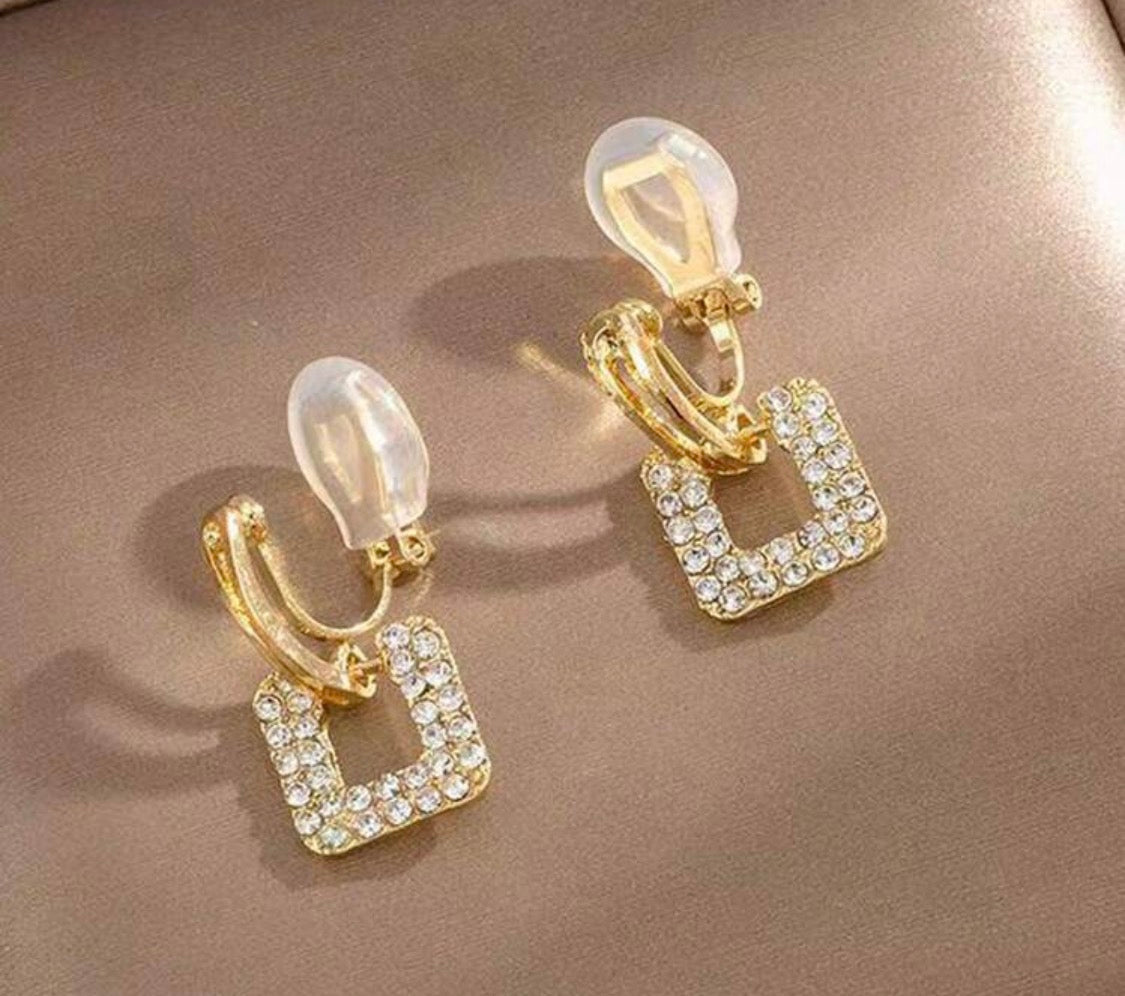 Make a bold impression with these eye-catching clip-on dangle earrings featuring geometric square designs in gleaming gold with radiant clear stones. At 1" in length, they offer the perfect balance of presence and wearability, catching light beautifully with every movement. The comfortable clip-on closure means you can enjoy sophisticated style without commitment to piercing—ideal for sensitive ears or those who love switching up their look. wardrobe.