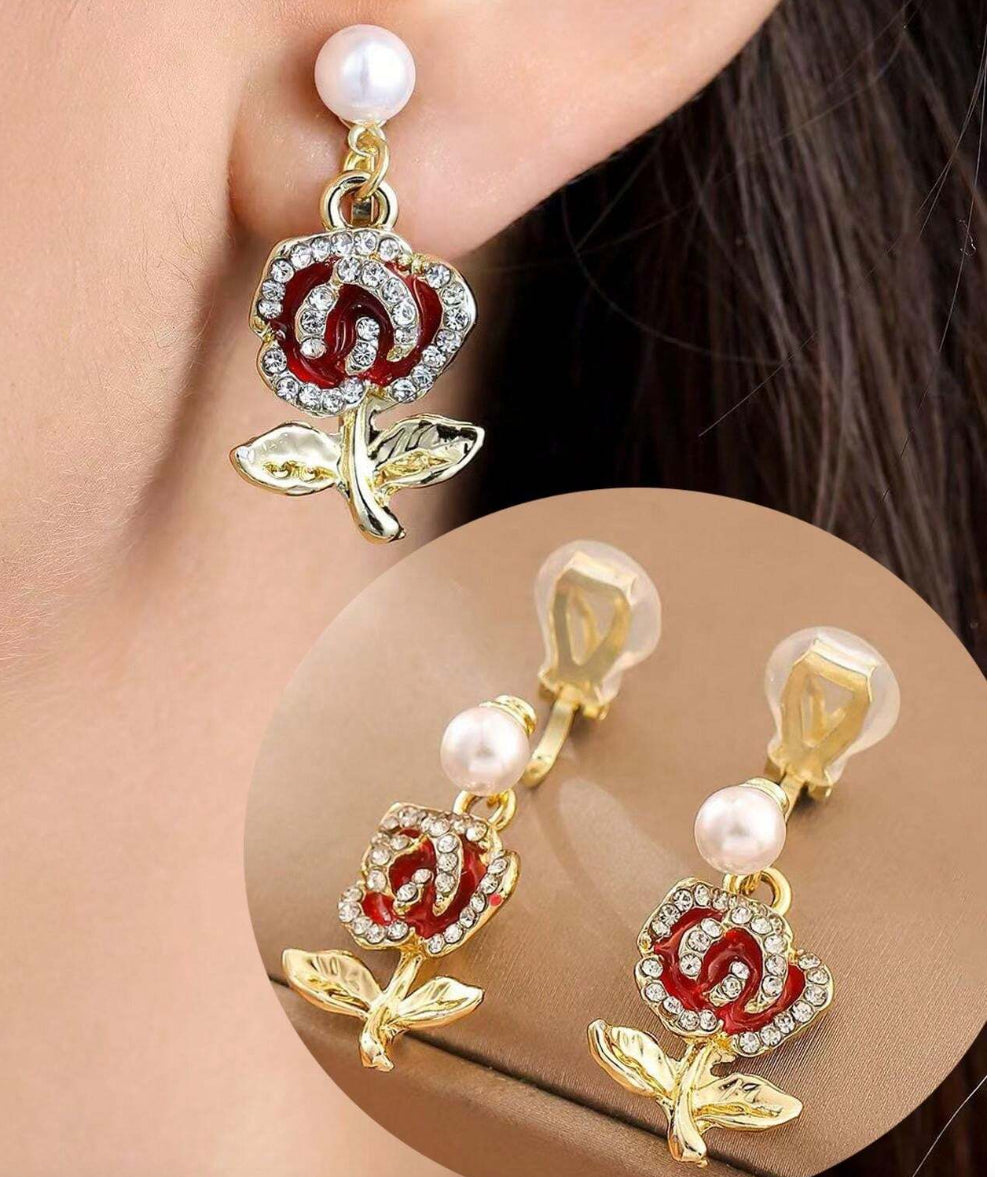 Elevate your style with these elegant 1 1/4" clip-on earrings featuring a striking gold and red flower design. Accented with lustrous pearls and sparkling clear stones, they add a touch of sophistication without the need for pierced ears. Perfect for any occasion, these earrings combine classic charm with effortless wearability.