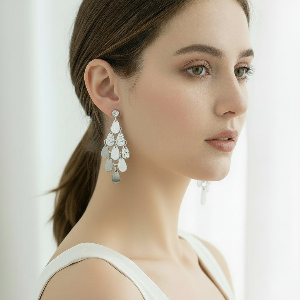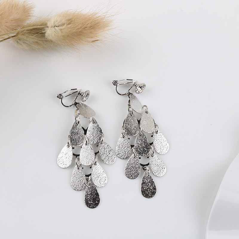 Clip on 2 3/4" silver textured layered teardrop dangle earrings